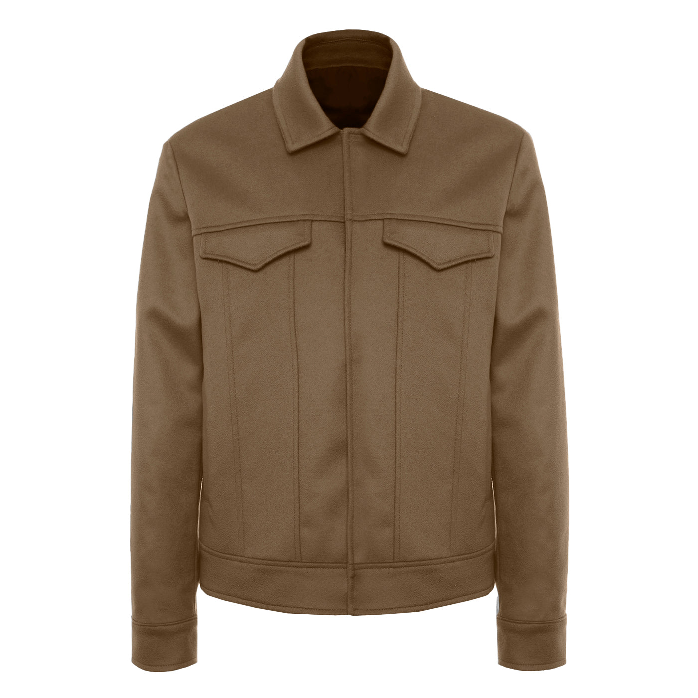 Giacca trucker slim fit in lana e cashmere con collo stile camicia, chiusura a bottoni a pressione, polsini con bottoni, due tasche con patta sul petto e due tasche laterali inserite.