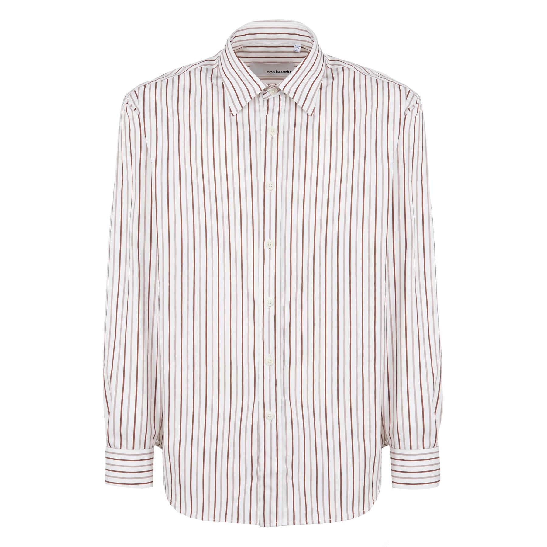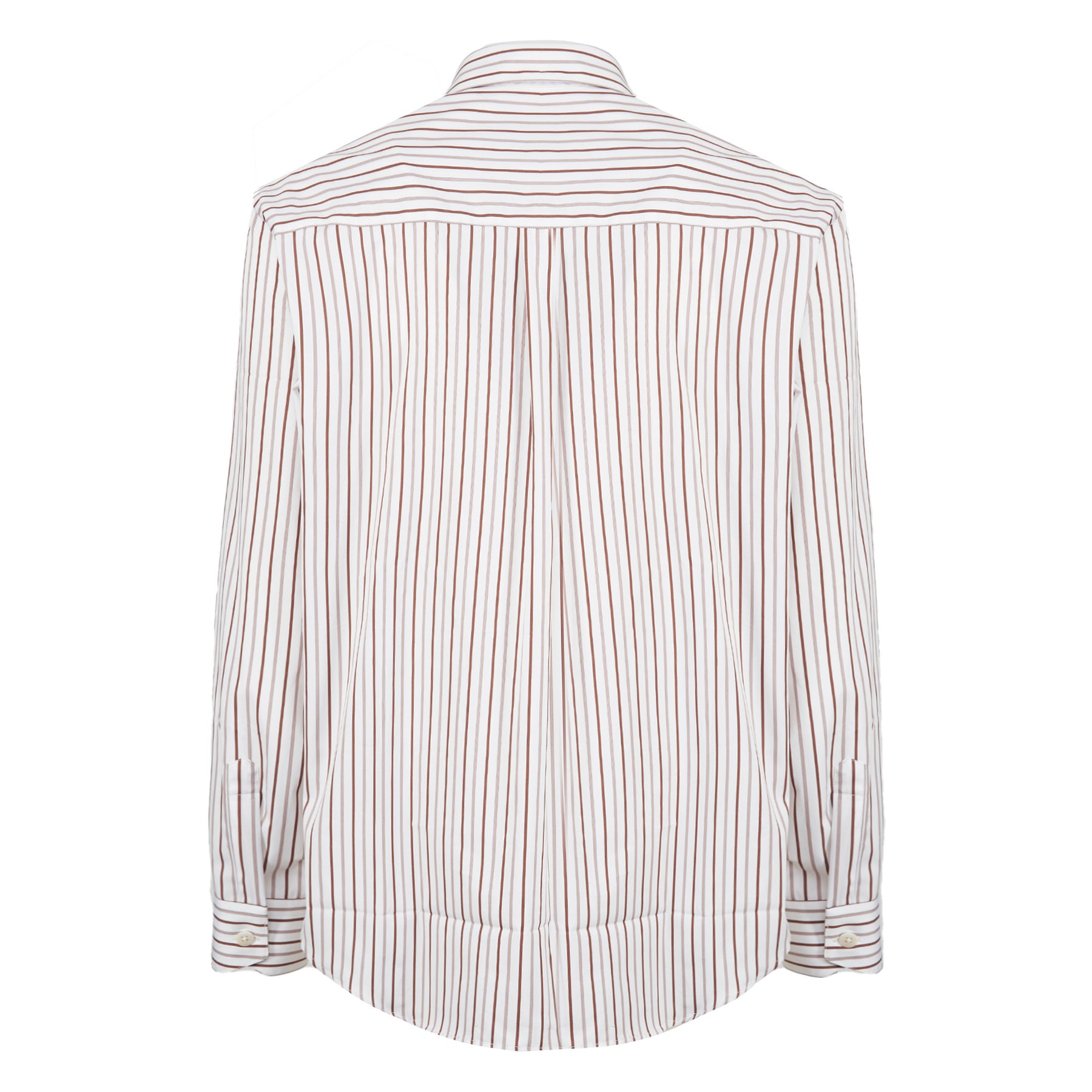Camicia Andrea a righe marroni in cotone, a vestibilità large fit con colletto italiano. Il dettaglio della piega a scatola sul retro garantisce comfort e libertà di movimento. Un capo elegante e versatile, ideale per un look casual ma raffinato.
