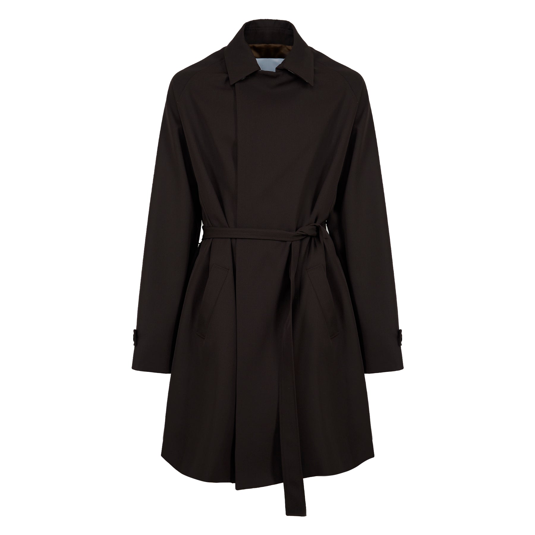 Cappotto Riko in stile trench marrone, con colletto italiano e chiusura doppiopetto essenziale, segnata da un solo bottone visibile all’altezza del collo.