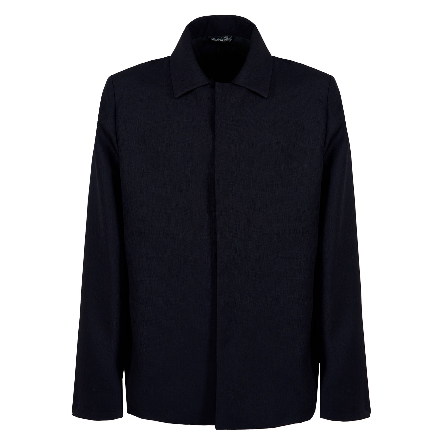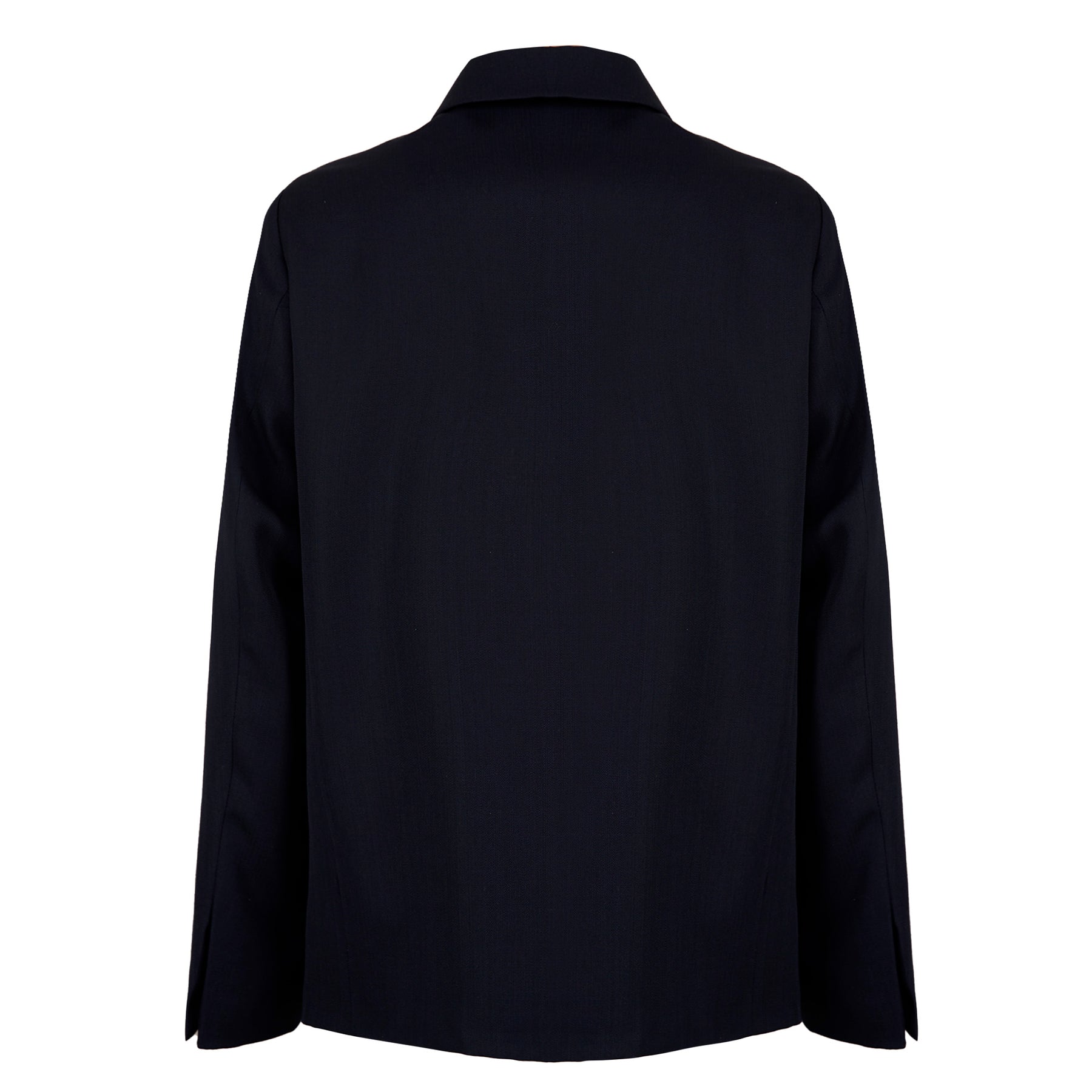 Boxy fit wool blazer with snap button fastening, two inset side pockets and shirt-style collar.