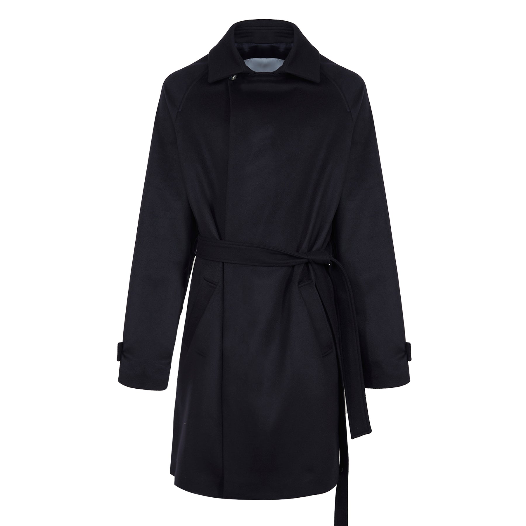 Riko coat in blue trench style, with Italian collar and essential double-breasted closure, marked by a single visible button at the neck.
